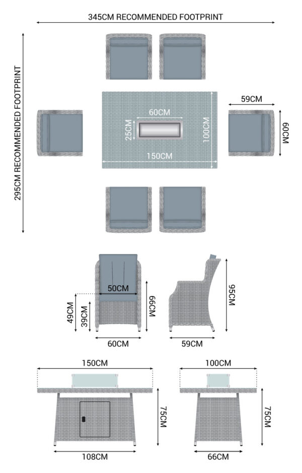 A standout feature of this set is the large rectangular rattan dining table, which includes a gas fire pit in the centre. This fire pit adds a unique touch to your outdoor space, providing warmth, light, and atmosphere that extends the usability of the set into the evening. When you don’t need the firepit, simply cover it with the metal lid provided to transform the table into a standard dining surface.