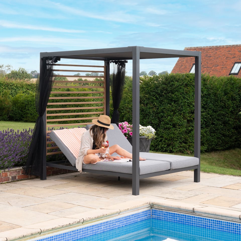 Transform your outdoor space into a luxurious retreat with the Alex 4-Poster Daybed. Designed for modern lounging and sustainable living, this daybed features side curtains that fully close for enhanced privacy and sliding roof panels that provide adjustable sun exposure. Whether you prefer basking in full sunlight or seeking shade, you have complete control over your environment.