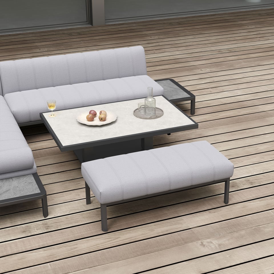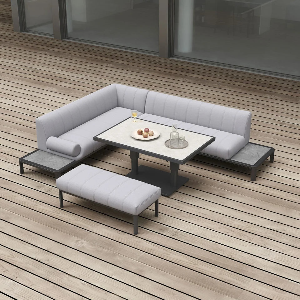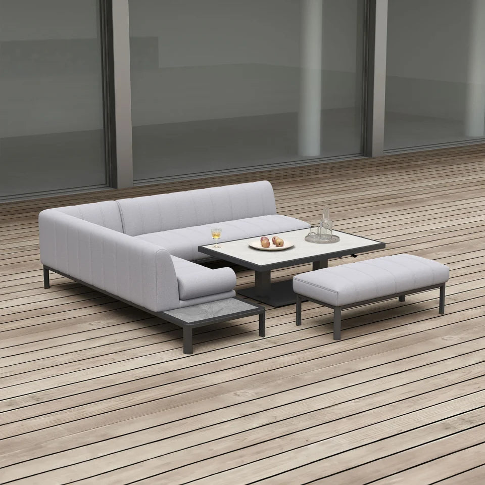 Monica Left-Handed Corner Sofa Lounge Dining Set with Rectangular Rising Table and Stool – Cloudy Grey