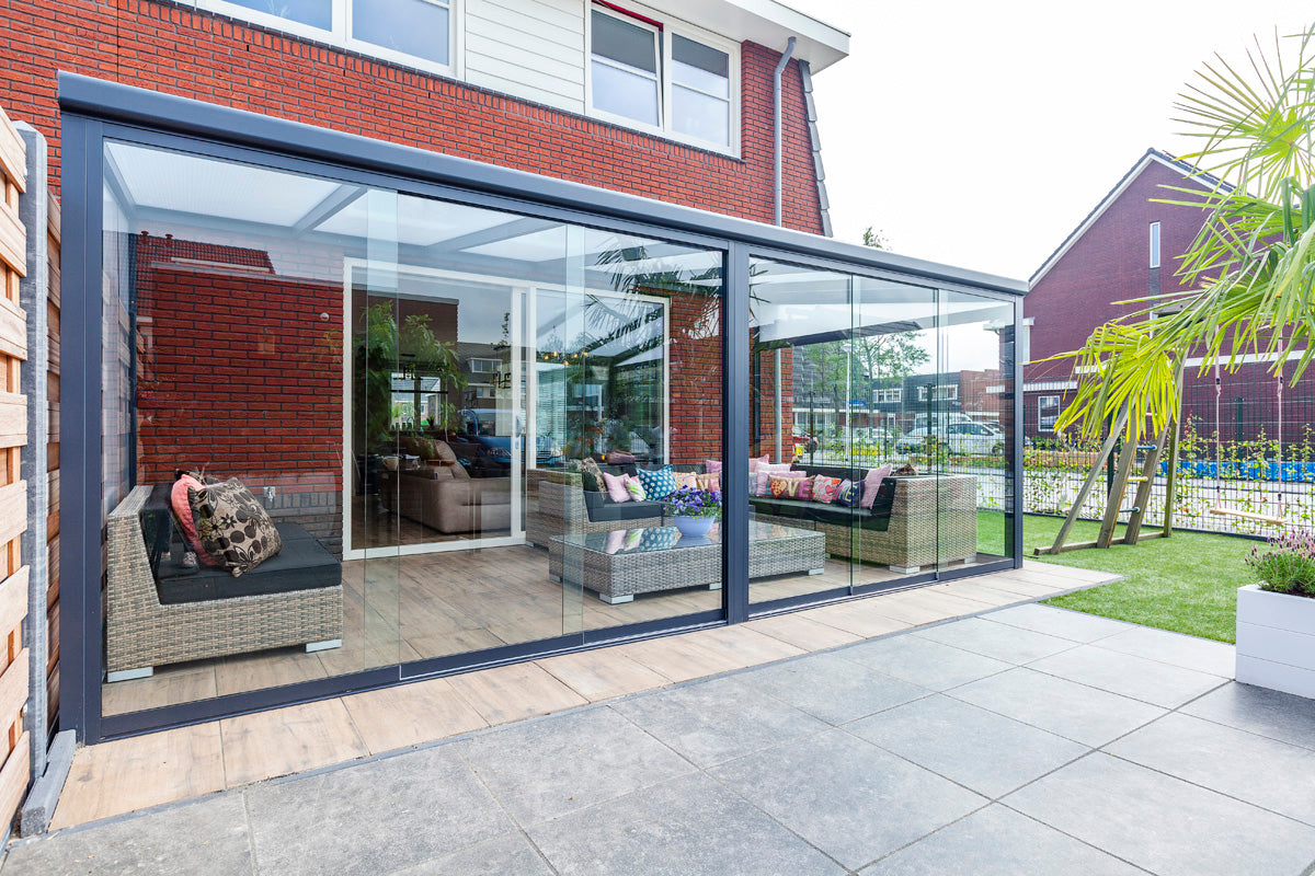 This veranda comes in a width of 4, 5 or 6 meters and has a depth of 2.5, 3 of 3.5 meters. The Nebbiolo is available in the colours cream white (RAL9001) and grey texturized (RAL7024) and has a polycarbonate roofing; a high-quality and sustainable material with a timeless look. This veranda is available in the colours clear, ultra clear, opaque and solar control; a heat-resistant variant.